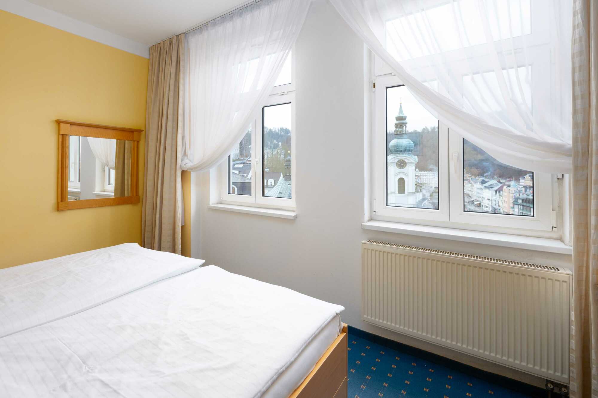 Dieses Dreibettzimmer mit Blick auf die Stadt und den Fluss in Karlovy Vary ist eine ideale Wahl für Familien oder kleine Gruppen. Das Zimmer bietet eine geräumige und komfortable Unterkunft mit drei Einzelbetten oder einer Kombination aus einem Doppelbett und einem Einzelbett. Der Blick aus den Fenstern wird Sie mit der Kulisse der Stadt und dem ruhigen Flusslauf verzaubern.